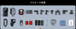 アクションカメラは、本体の価格がそこそこでもオプションがいろいろ必要で、最終的には10万円を超えてしまうこともありますが(汗)、この製品は、さまざまな「部品」が標準のパッケージに入っているのがポイントです。