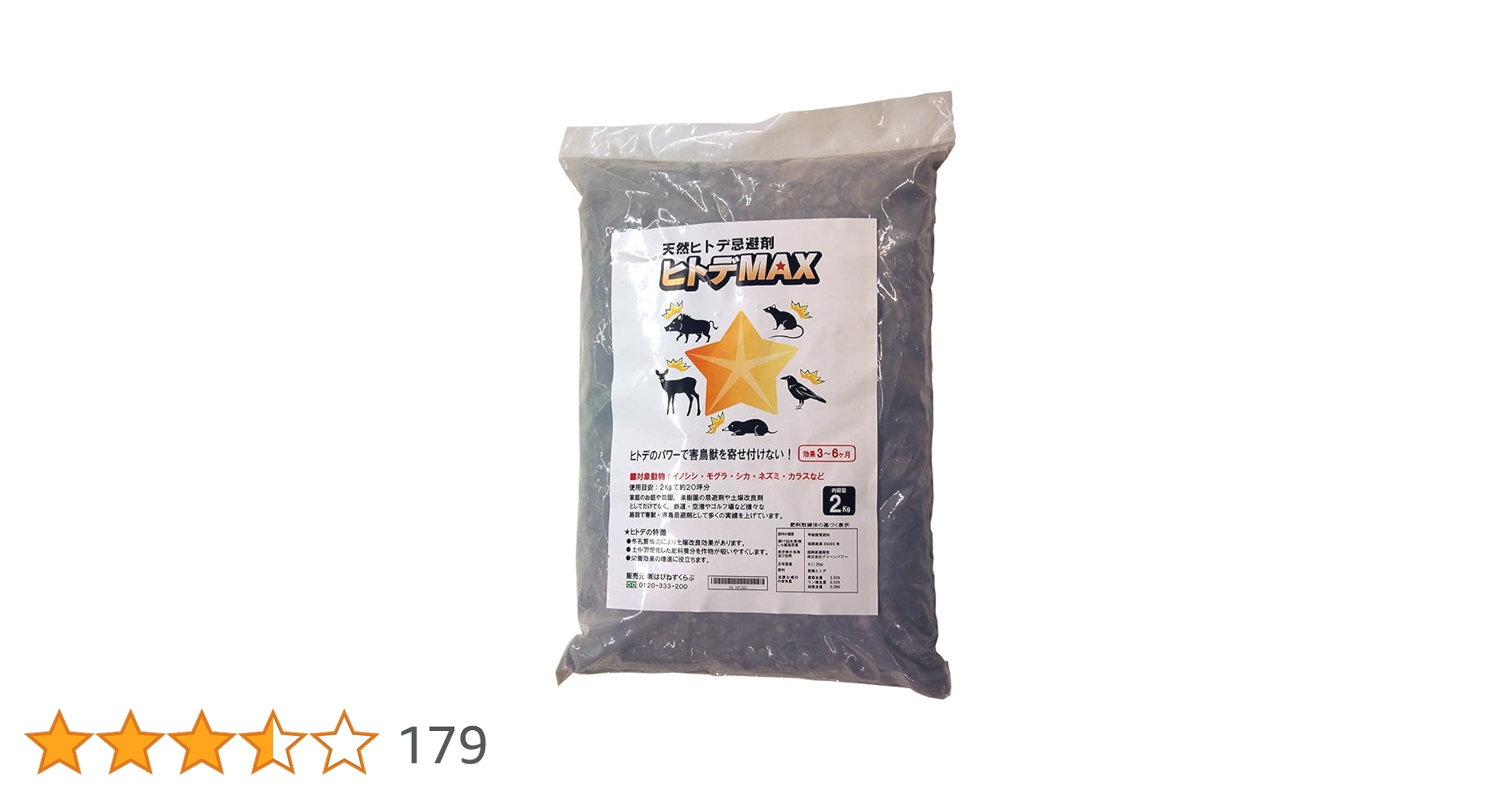 小分け用の袋も4枚入っています。ヒトデは自己防衛のために外敵を寄せ付けないように生息している作用を利用した有害鳥獣や環境外虫を寄せ付けないことに着目した乾燥ヒトデを使用した忌避剤です。まいたり、つるしたり、水溶液にして土壌にしみこませるなど、その汎用性が人気の秘密です。ヒトデはミネラル分が豊富なので、土壌改良材としても利用できるのもポイントです。効果は最大3~6ヶ月です。