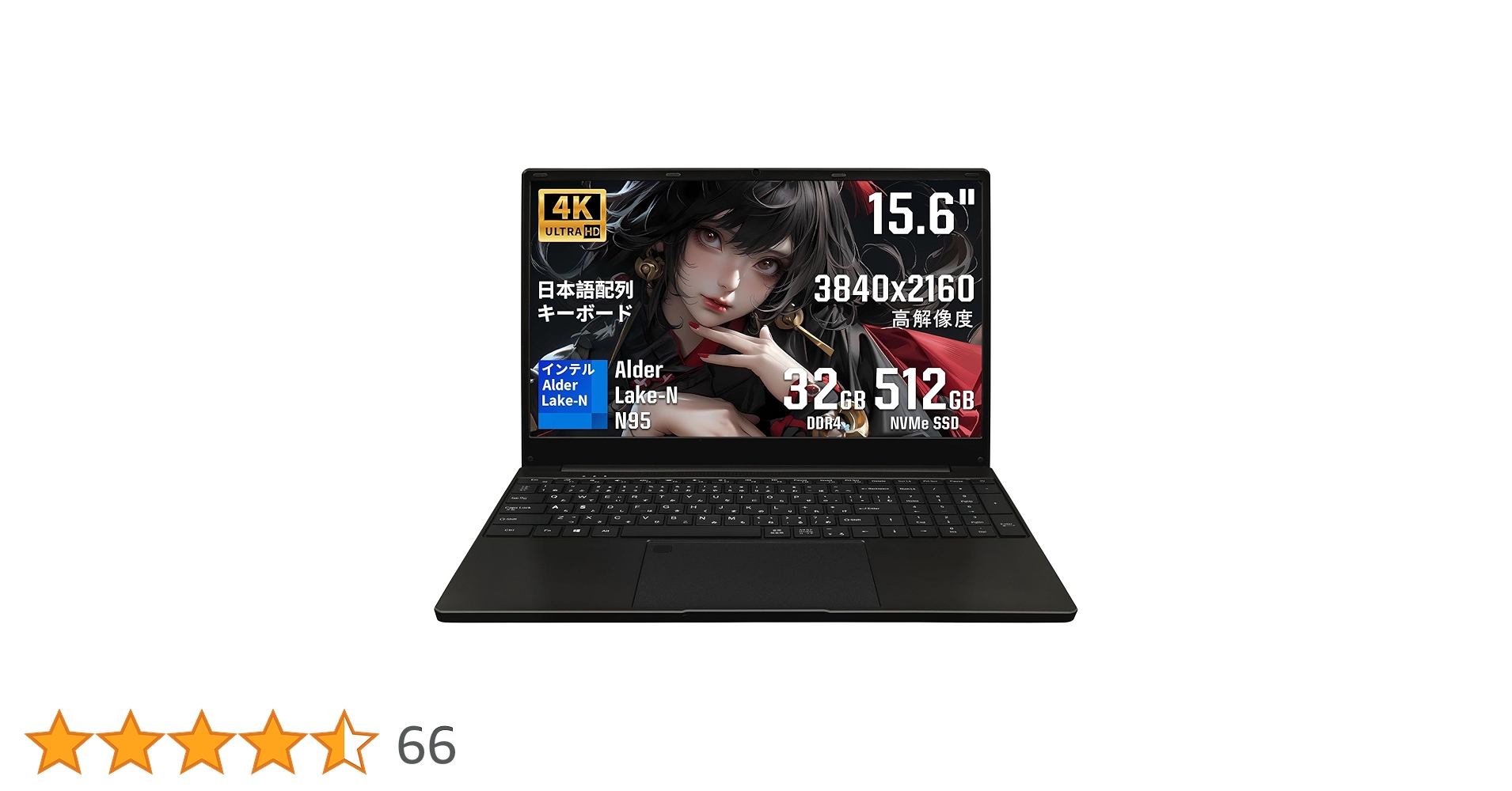 15.6インチ 4K液晶(3840x2160)インテルN95 ノートパソコン全金属筐体 /32GB DDR4 高速NVMe SSD/指紋認証/日本語配列キーボード付き/webカメラ付き薄型軽量ノートpc/windows 11 MS Office 2019/ ラップトップ laptop初心者向け・ZOOM・授業用・在宅勤務 (4K/N95/ブラック, 32GB+512GB)